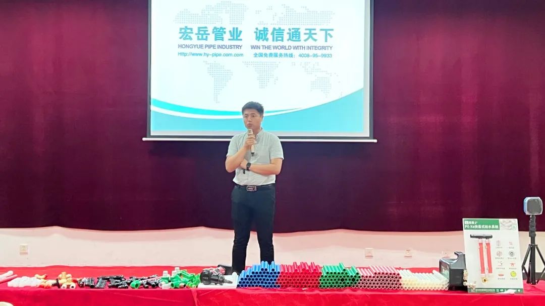 www.huatihui.com1+区域运营经理向各位参会者介绍了www.huatihui.com塑胶集团概况,并着重讲解了www.huatihui.com1+产品体系及PE-Xa快易连接管道系统,凭借其简单、快捷、安全的产品及连接优势,得到了与会水电技师们的高度好评。